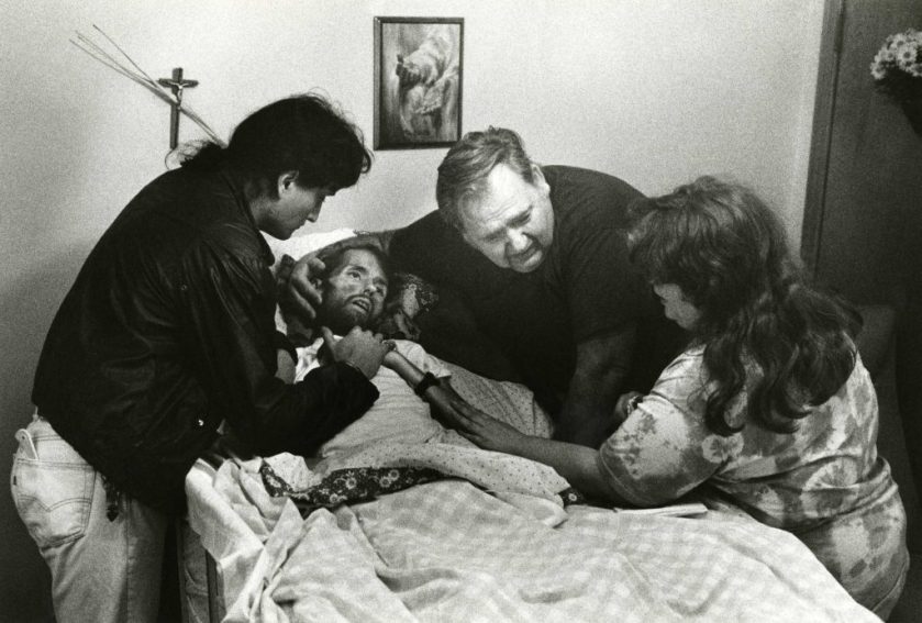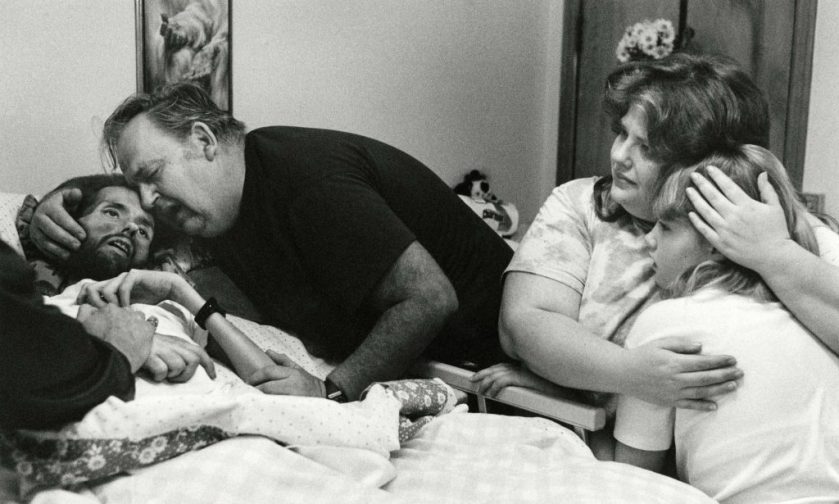 In another of Therese Frare’s photos taken in the final moments of David Kirby’s life, goodbyes were said by his caregiver and friend, Peta; David’s father; and David’s sister, Susan.